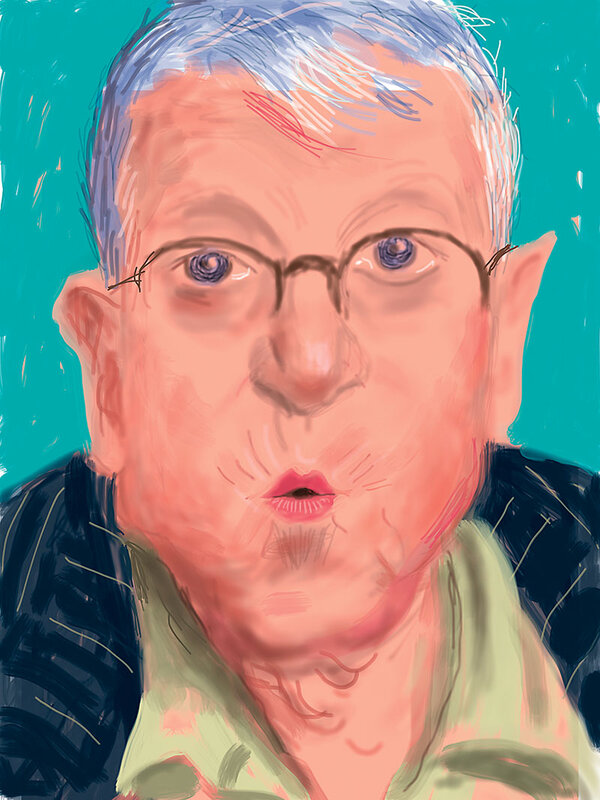 Other treats of the show include a recent animated video that Hockney overlaid on images of his 1980s set designs for opera productions. Several new, previously unexhibited paintings are also on display – a 2023 self-portrait and two paintings titled “Less Is Known Than People Think,” one inspired by a drawing by Edvard Munch, the other by William Blake’s illustrations.