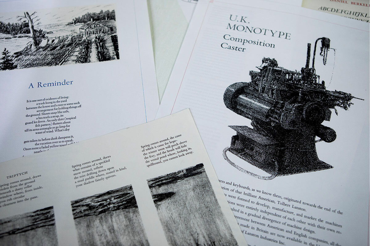 Lately he’s been mentoring an apprentice, a student from nearby Maine College of Art & Design, who shares his taste in music and also for tedium. “I’ll ask Claire to put away the type,” he says, “and she’ll respond, ‘Oh, I love putting away type!’”