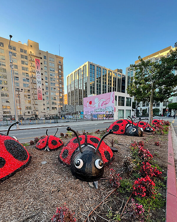 The city’s historic business district and surrounding neighborhoods are the backdrop for contemporary street artist S.C. Mero , who sees opportunity in a landscape dogged by disappointment and deferred dreams. The Minnesota native embraced the area, known as DTLA, after graduating from the University of Southern California (USC) a decade ago. Today, her rogue installations are part of downtown’s creative fabric – and local authorities are in on it. She’s been honored by the city for her contributions to the Skid Row neighborhood and commissioned by the nearby Fashion District to decorate a median at an intersection.
