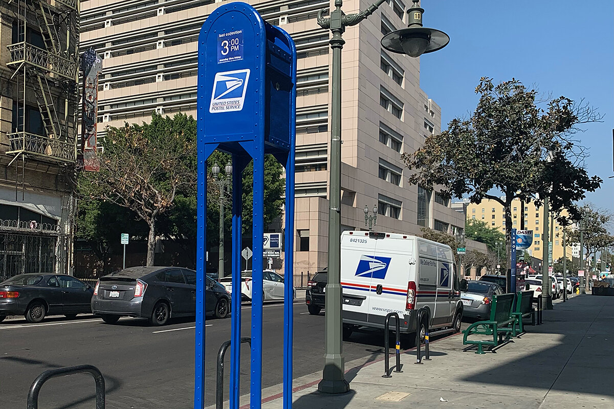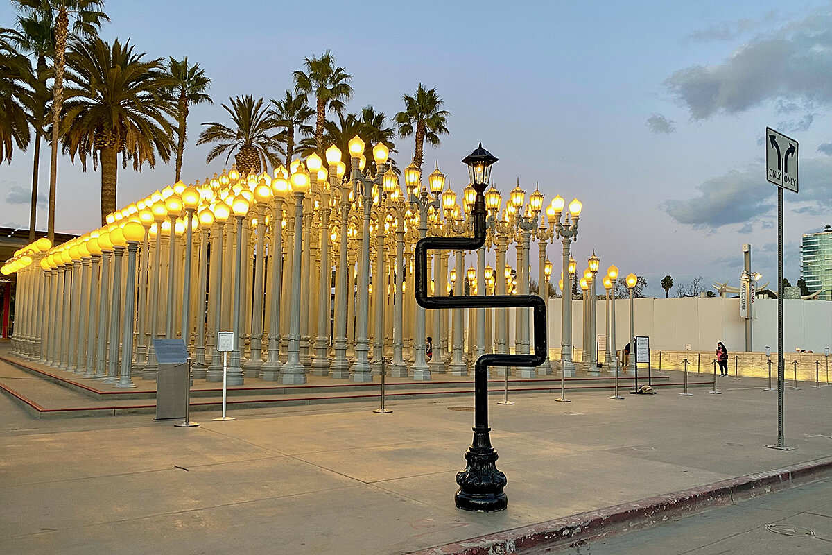 In downtown Los Angeles, absurdity interrupts urban blight: A fire hydrant sprouts stockinged legs; a winged telephone leaps from a phone booth; a mailbox towers, inaccessible, over passersby.