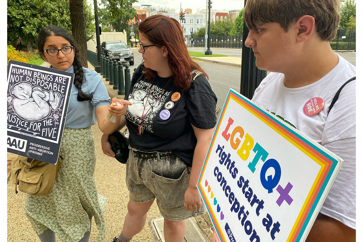 Back at the Hart Senate Office Building, Ms. Couture of Generation Ratify notices three young people standing nearby holding anti-abortion signs, and her face lights up.