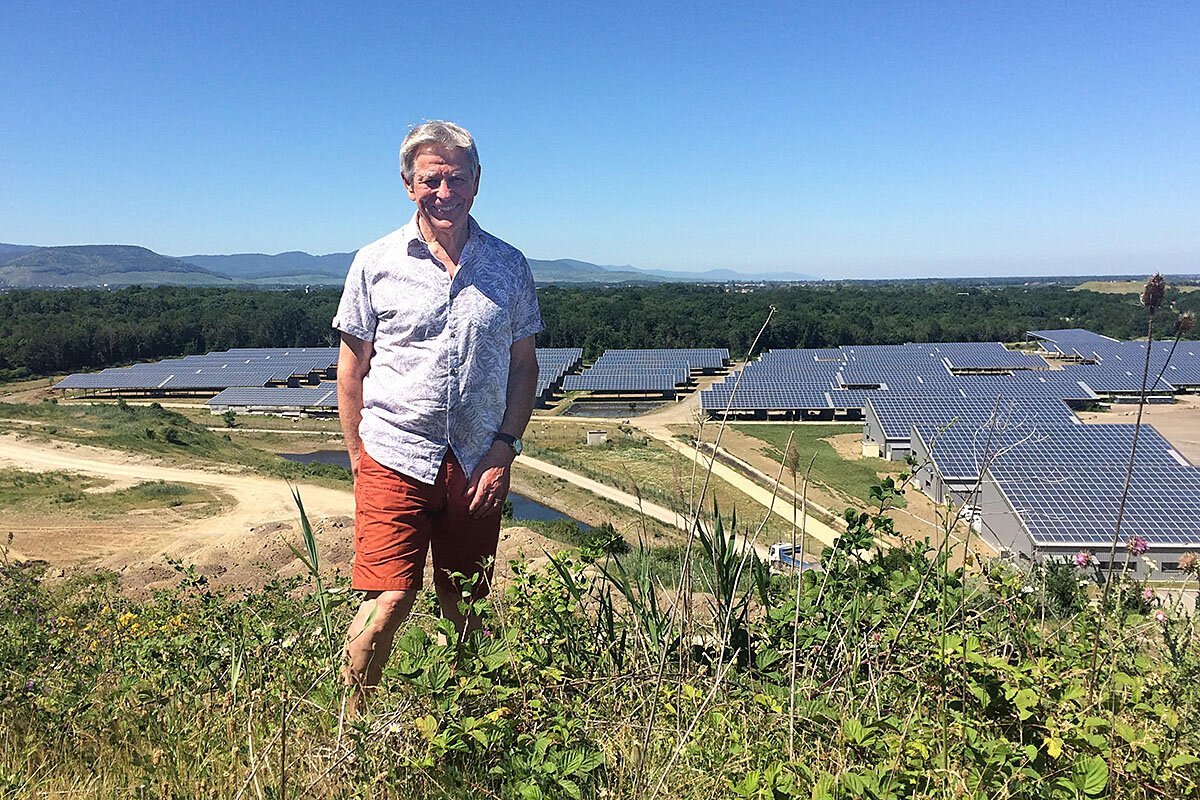 Ungersheim’s solar farm sits in a low valley on the edge of town, sandwiched between the lush Vosges Mountains and the mirage-like dense green of Germany’s Black Forest. Just a few miles away is Fessenheim, the oldest and most controversial nuclear power plant in France.