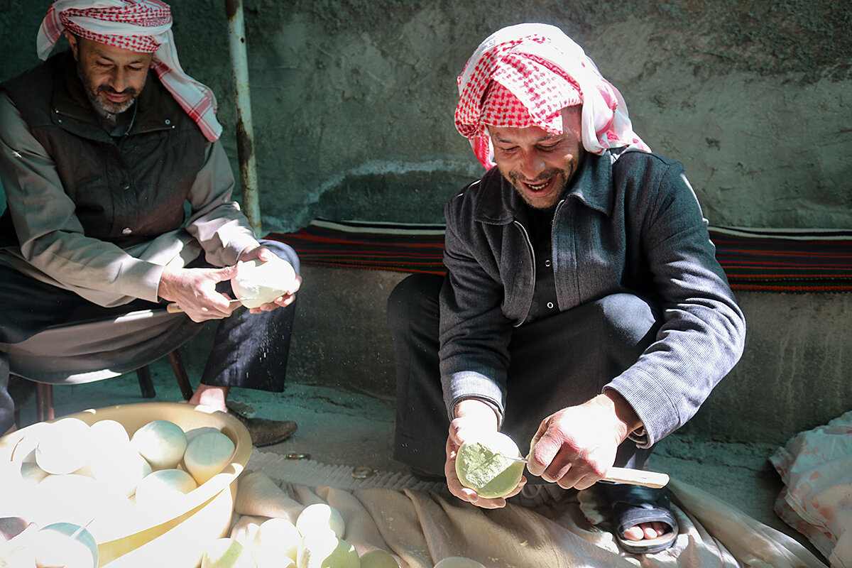 Outside, the Malahmeh men grunt in agreement as they crouch down and to scrape off salt crystals from dried jameed ready for sale.