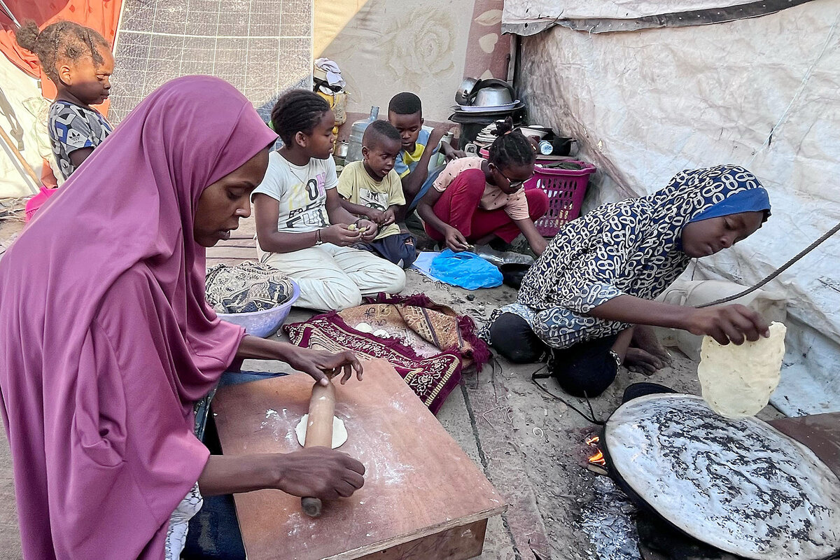 In the central Gaza city of Deir al-Balah, Merhan Abu Qinas kneels over a makeshift stove, flattening dough. Gathered around her, beside their tattered tent, her six children wait in exhausted silence.